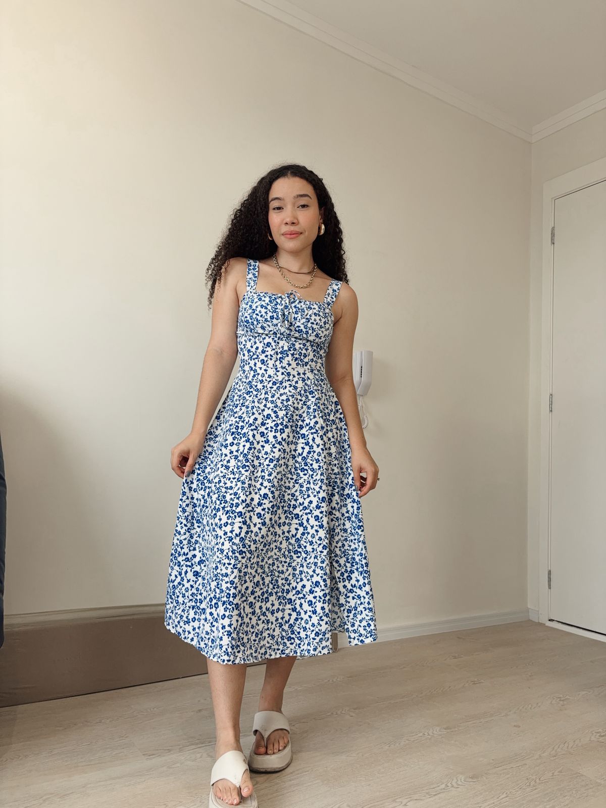 Vestido alcinha acinturado com amarração Talita midi flores